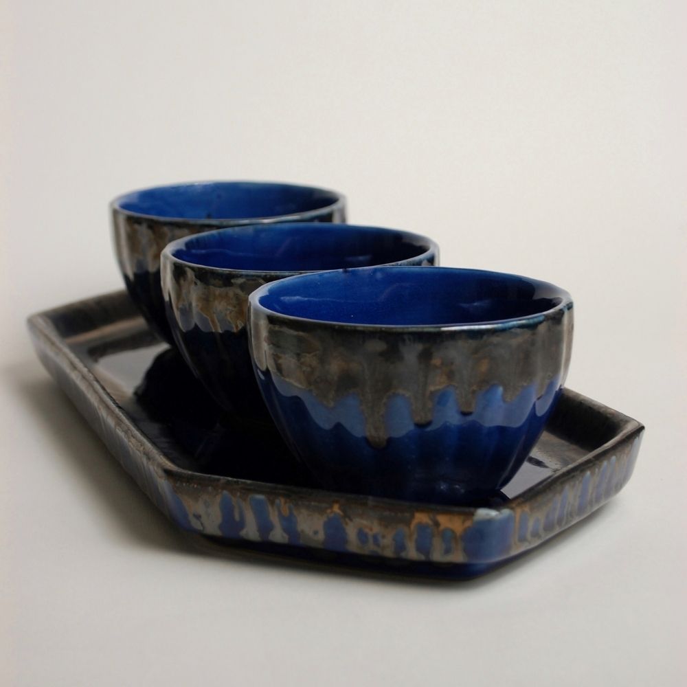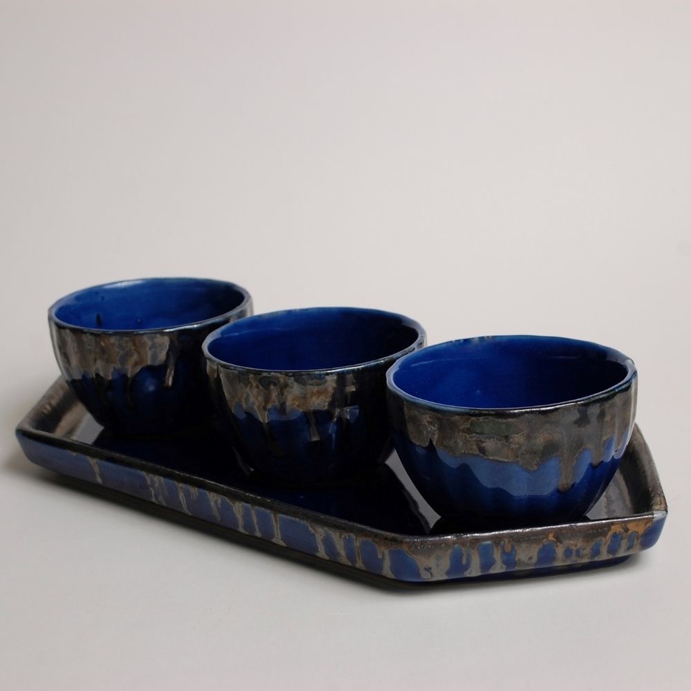 Striking and versatile, the Azure Shadow Platter Set features a glossy hexagon platter paired with three matching bowls. Designed in deep navy blue with bold black drip rims, this set is perfect for serving dips, starters, or desserts.