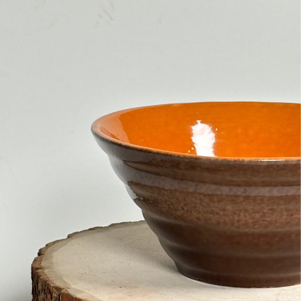 Warm tones, bold contrast. The Burnt Ember Bowls feature a rich, glossy brown exterior paired with a vibrant orange interior — a striking blend that brings depth and warmth to your serveware. Perfect for cereals, snacks, or desserts.