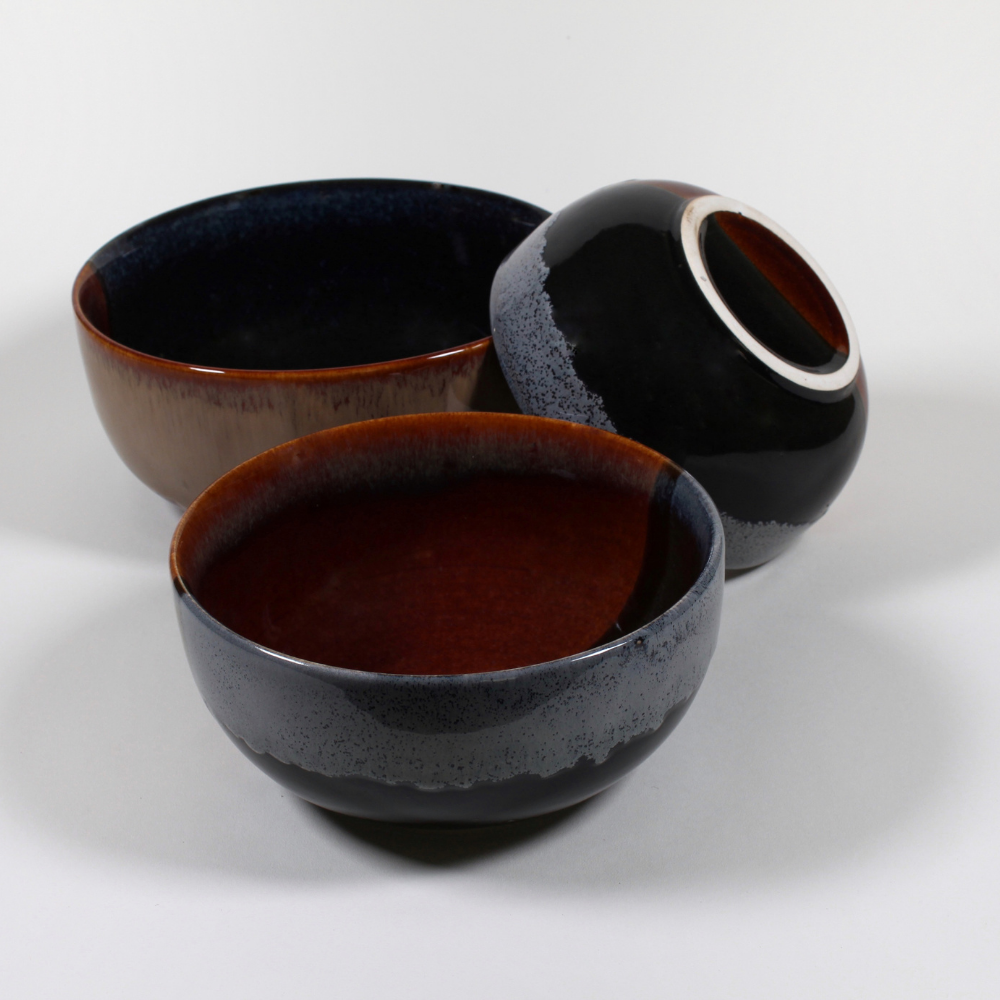 Rich tones, glazed depth. The Stonefire Trio brings together three uniquely colored serving bowls in earthy brown, deep blue, and cool grey. Each bowl features a glossy ceramic finish, blending function with quiet sophistication. A versatile addition to any serveware collection.